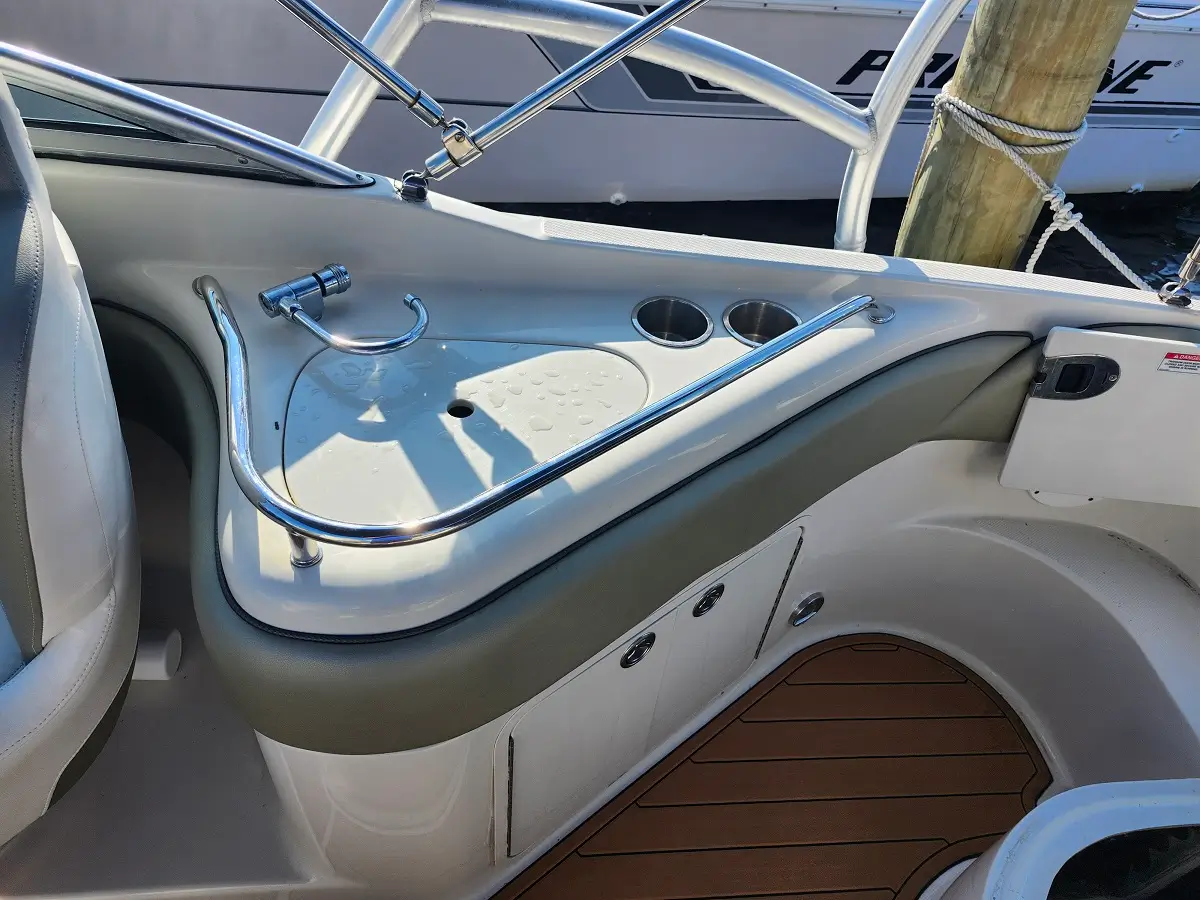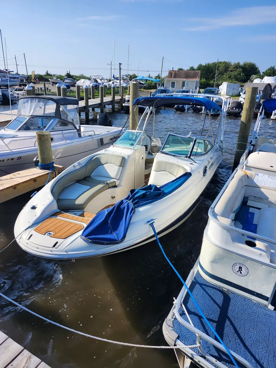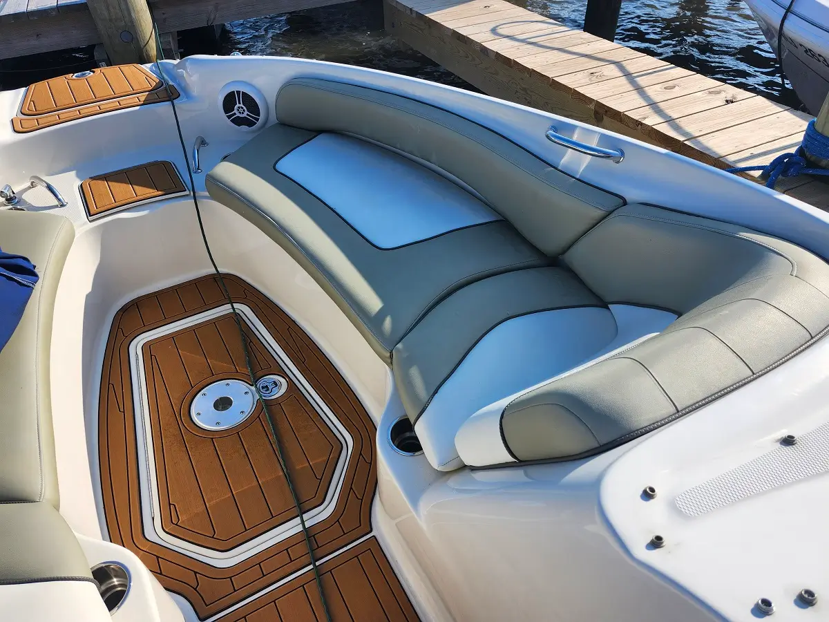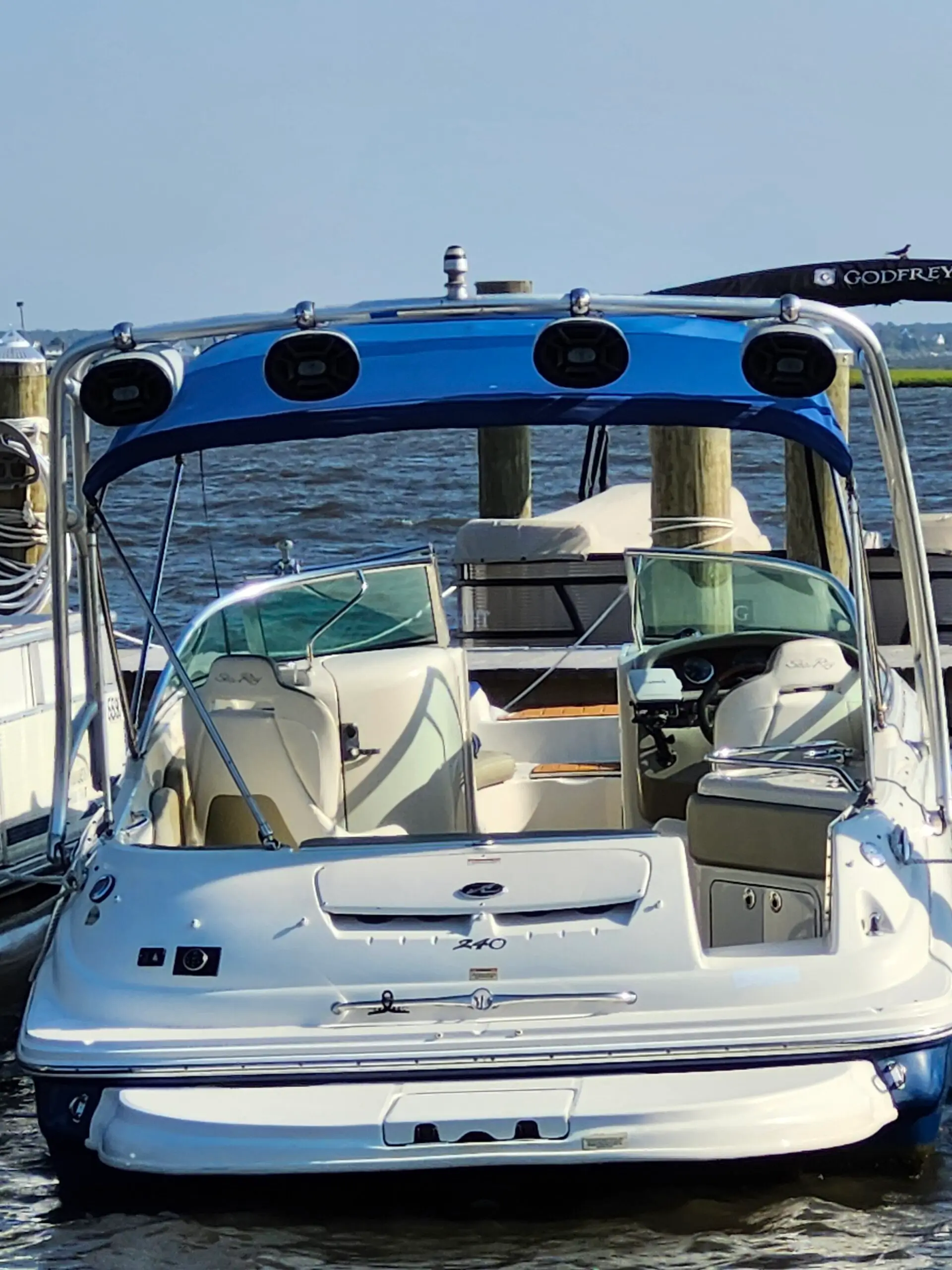 The owner is moving, and now this is being offered to a new owner. The 2007 Sea Ray 240 Sundeck has generous seating and a head built into the side console. It’s powered by a Mercruiser Mag 350 MPI with 300 horsepower. There are only 376 hours on the engine, and the manifolds, risers, and oil pan were replaced 2 years ago. For electronics, it has a stereo system and GPS. Large speakers are mounted on the optional aluminum arch. To make the boat look nicer and add comfort, the owner had decking added to the boat. The boat also comes with a bimini top and cockpit covers.