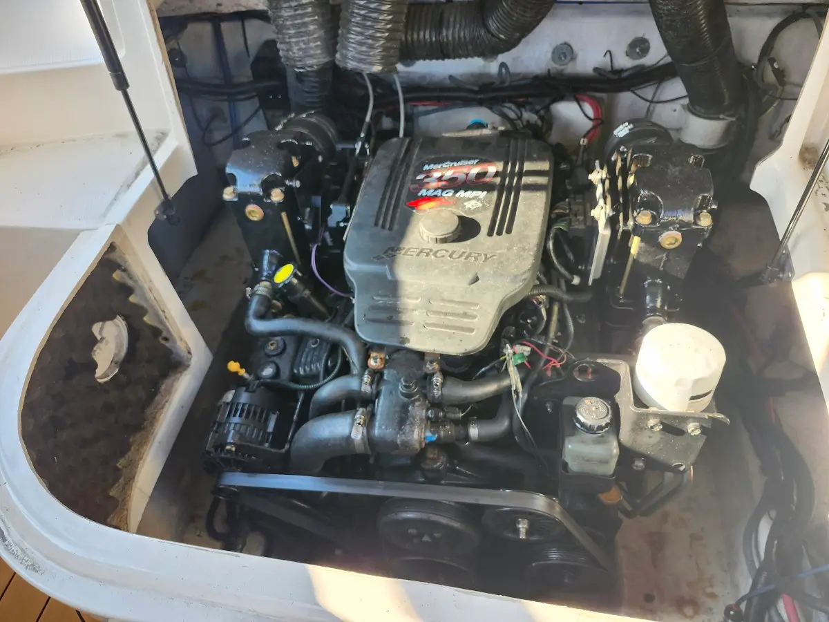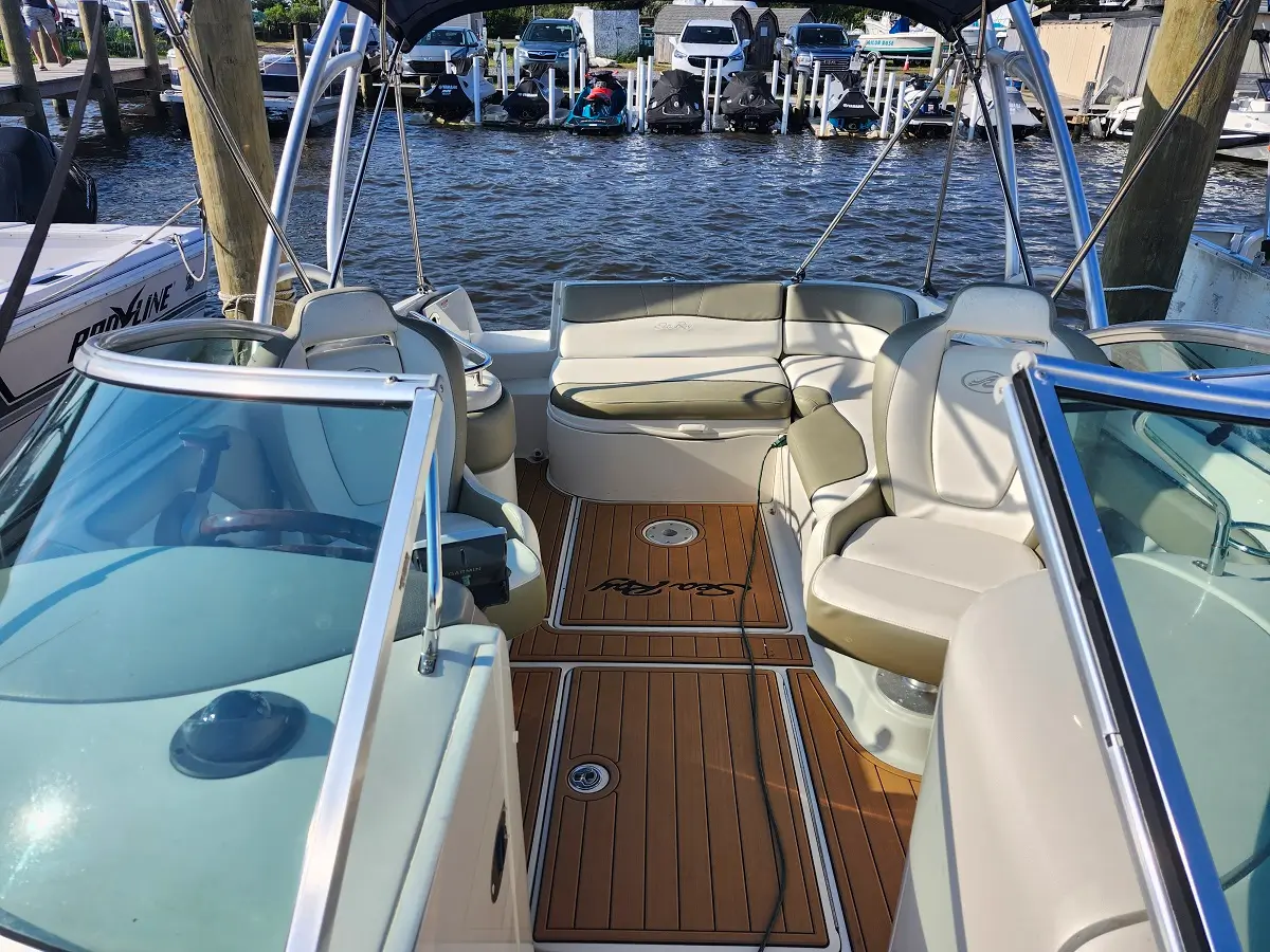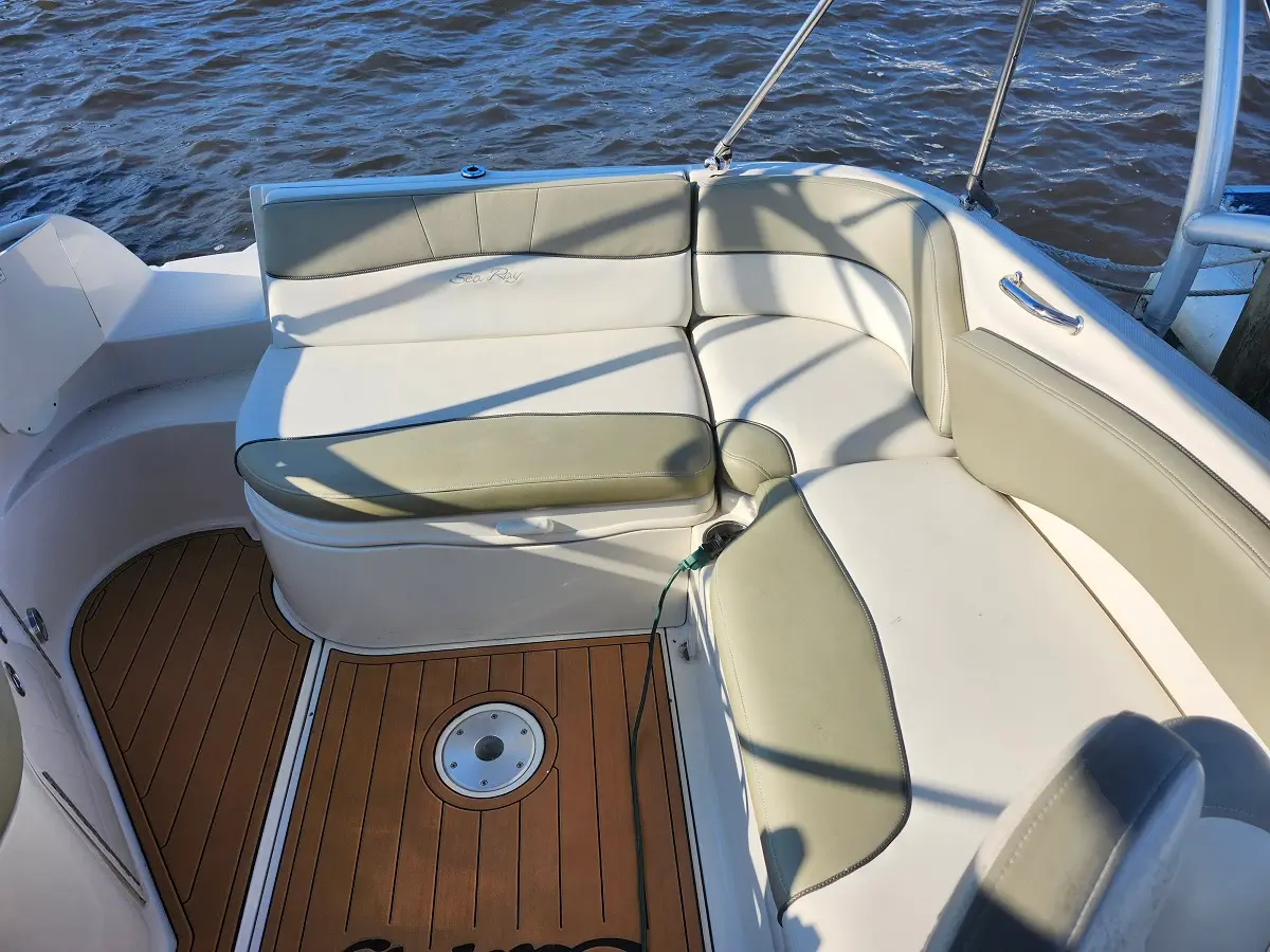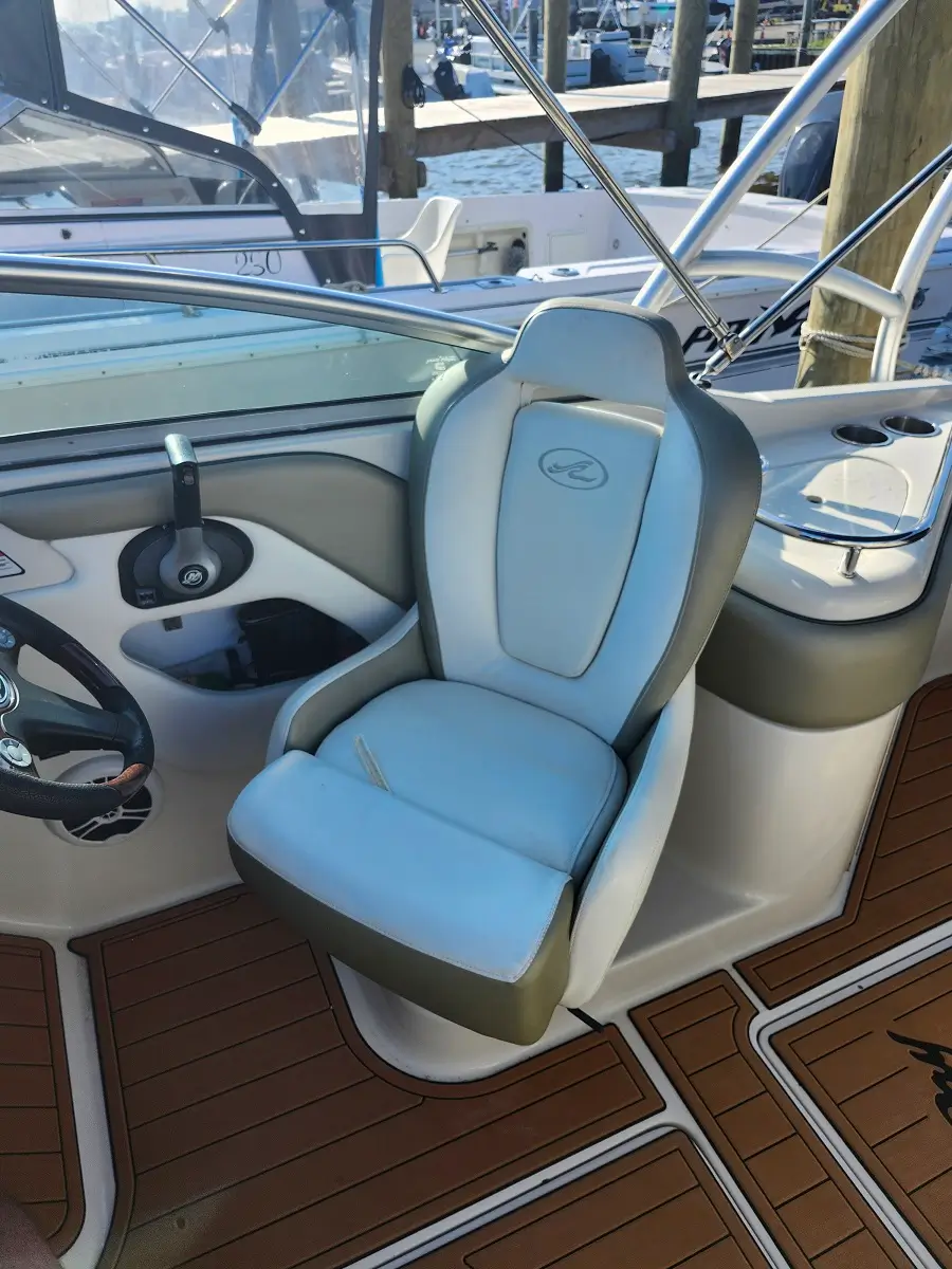 The owner is moving, and now this is being offered to a new owner. The 2007 Sea Ray 240 Sundeck has generous seating and a head built into the side console. It’s powered by a Mercruiser Mag 350 MPI with 300 horsepower. There are only 376 hours on the engine, and the manifolds, risers, and oil pan were replaced 2 years ago. For electronics, it has a stereo system and GPS. Large speakers are mounted on the optional aluminum arch. To make the boat look nicer and add comfort, the owner had decking added to the boat. The boat also comes with a bimini top and cockpit covers.